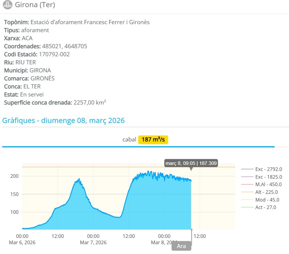 El sábado/domingo por la mañana, el visor en tiempo real de la Agencia Catalana del Agua mostraba avisos de peligro en las comarcas de Girona.
