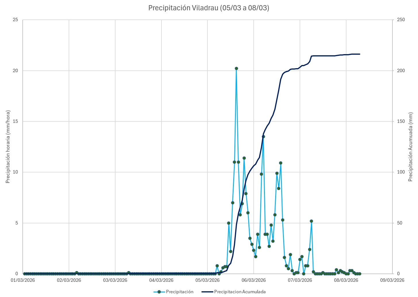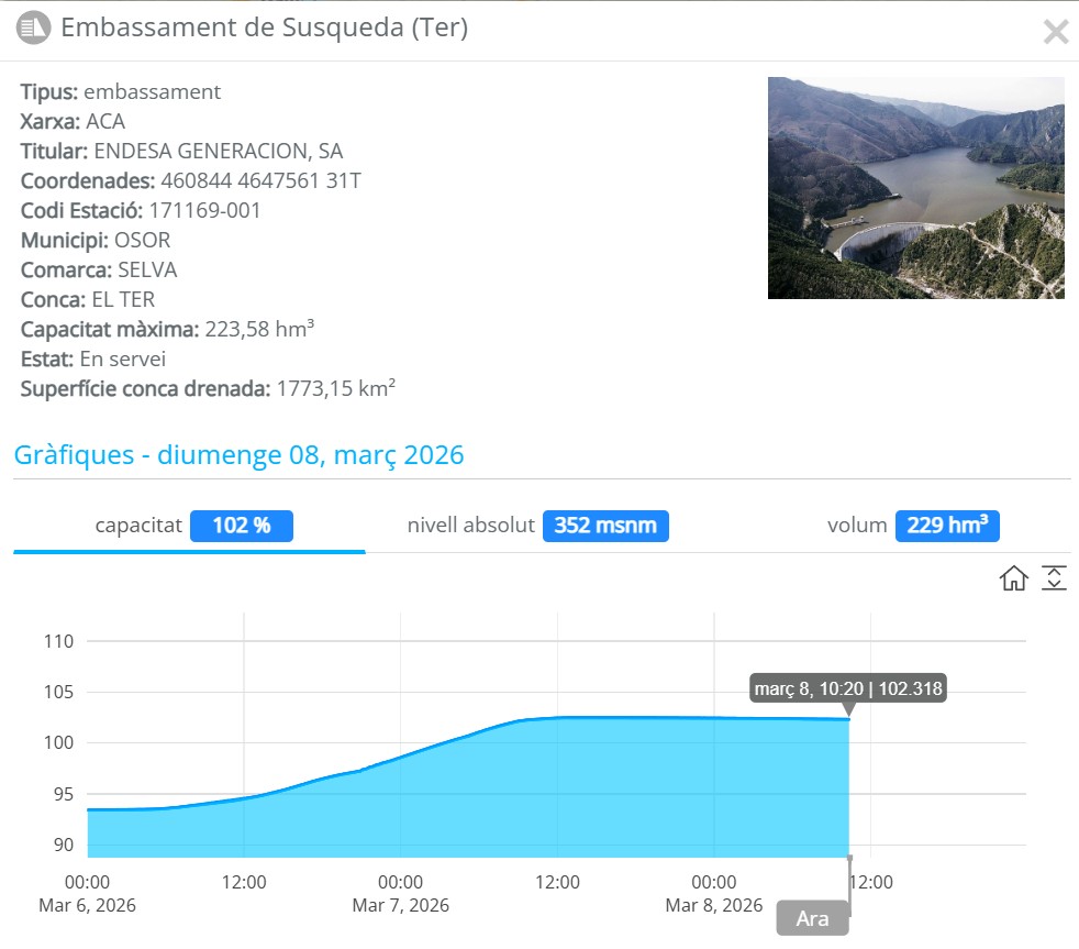 Una de las estaciones que presentó una mayor precipitación fue la de Viladrau. Entre las 9 de la mañana del 5/3 y las 15:00 del 6/3 acumuló 194 mm. Desde el inicio del año hidrológico, esta estación acumula 746,7 mm.
